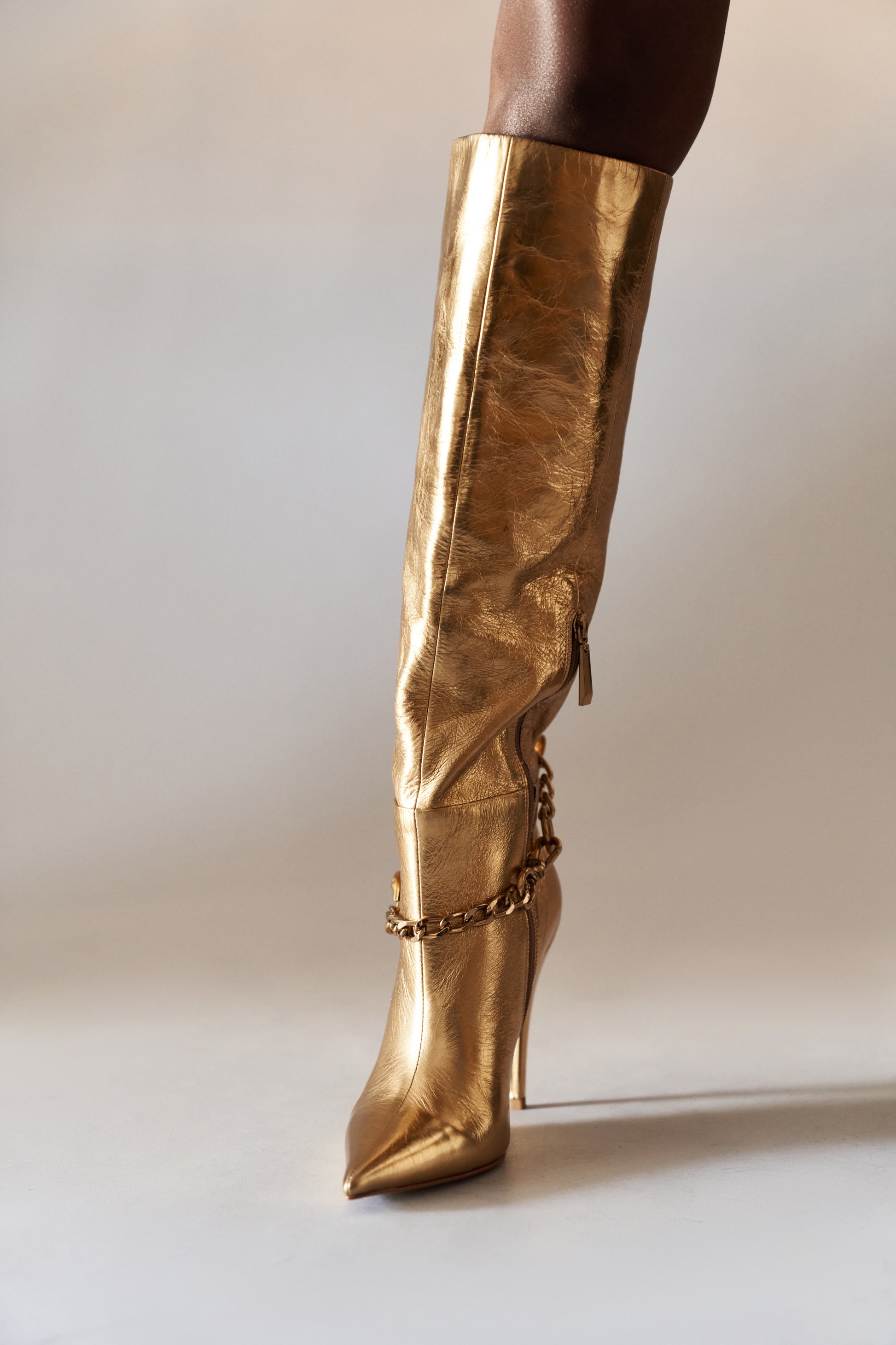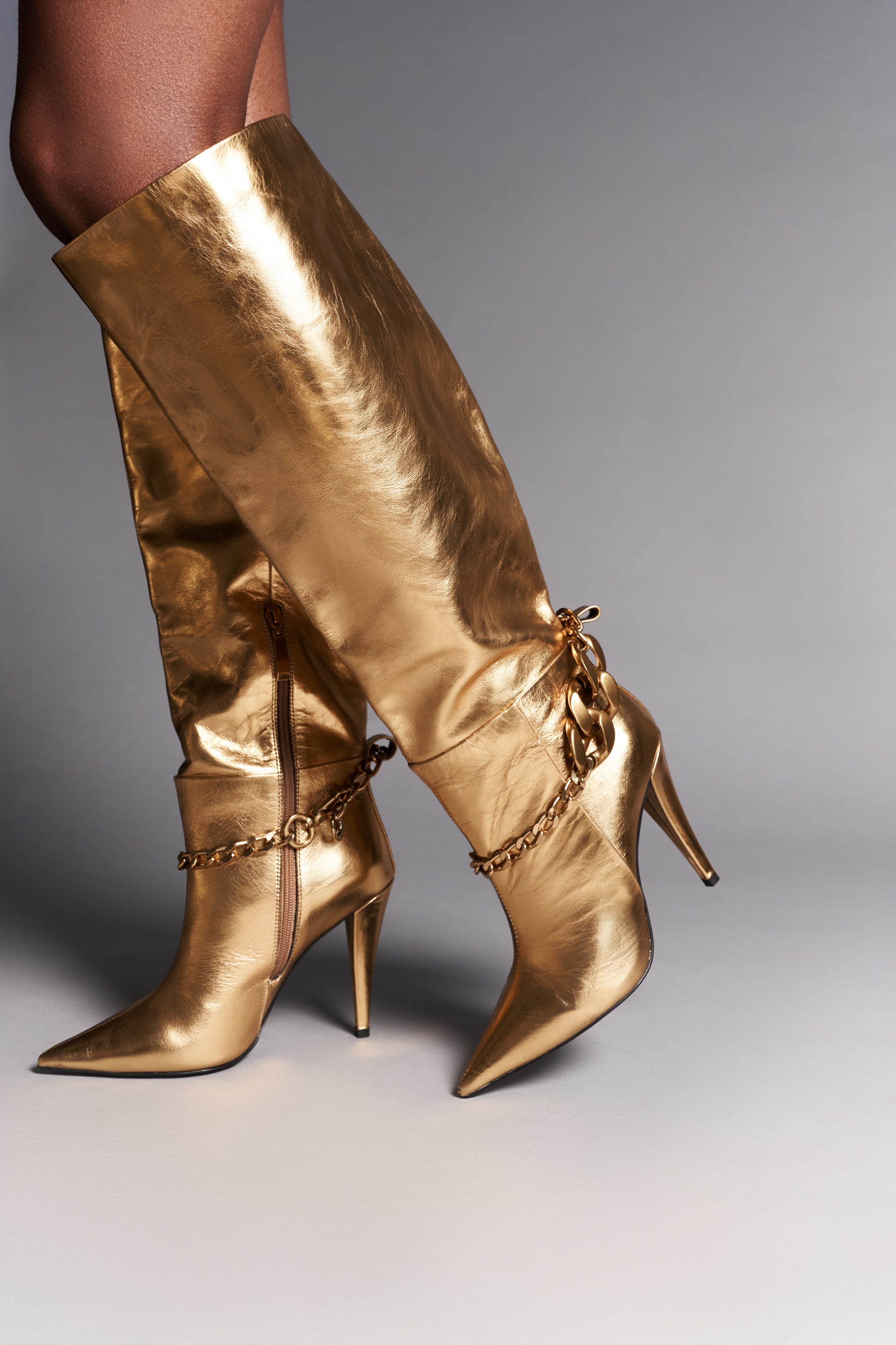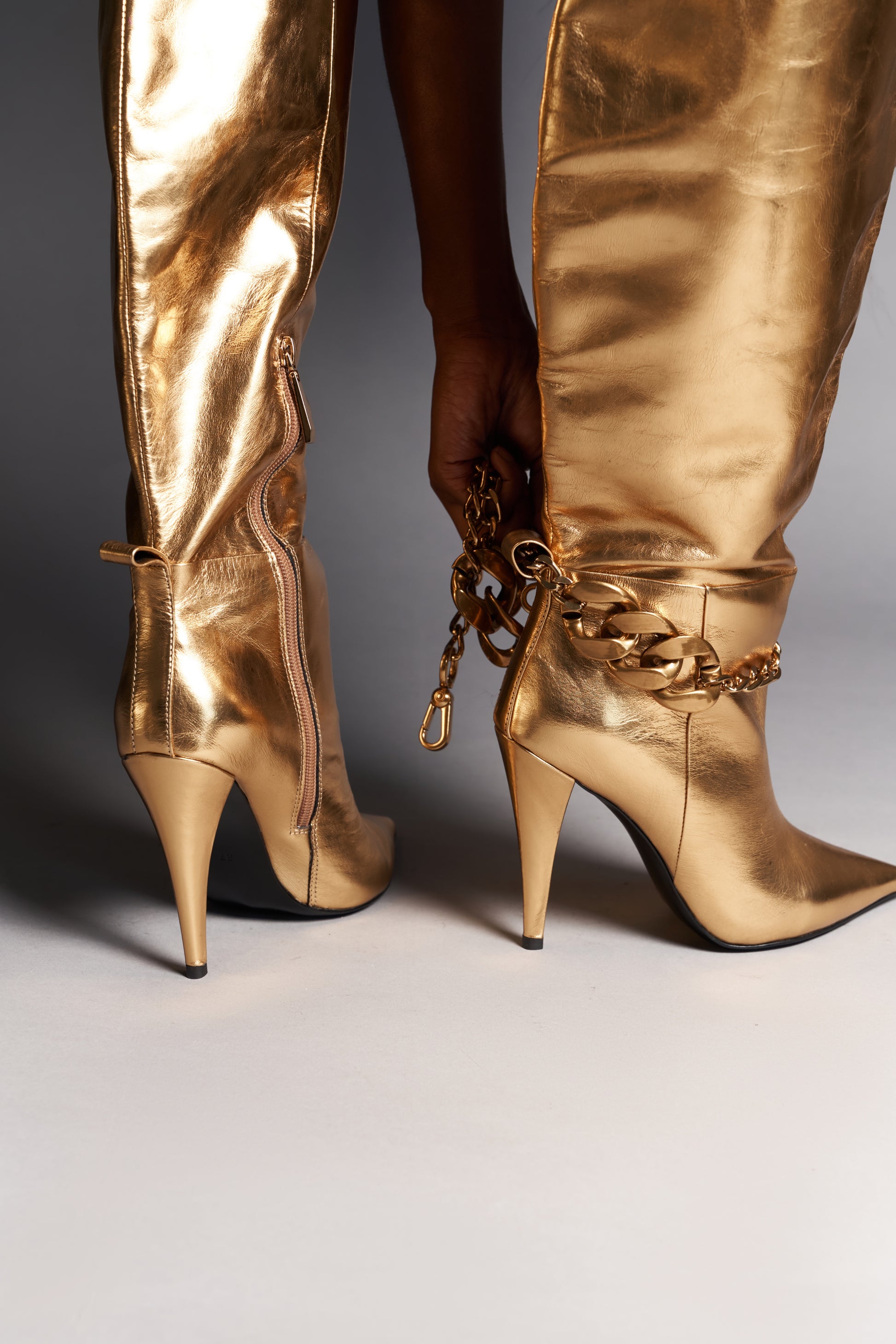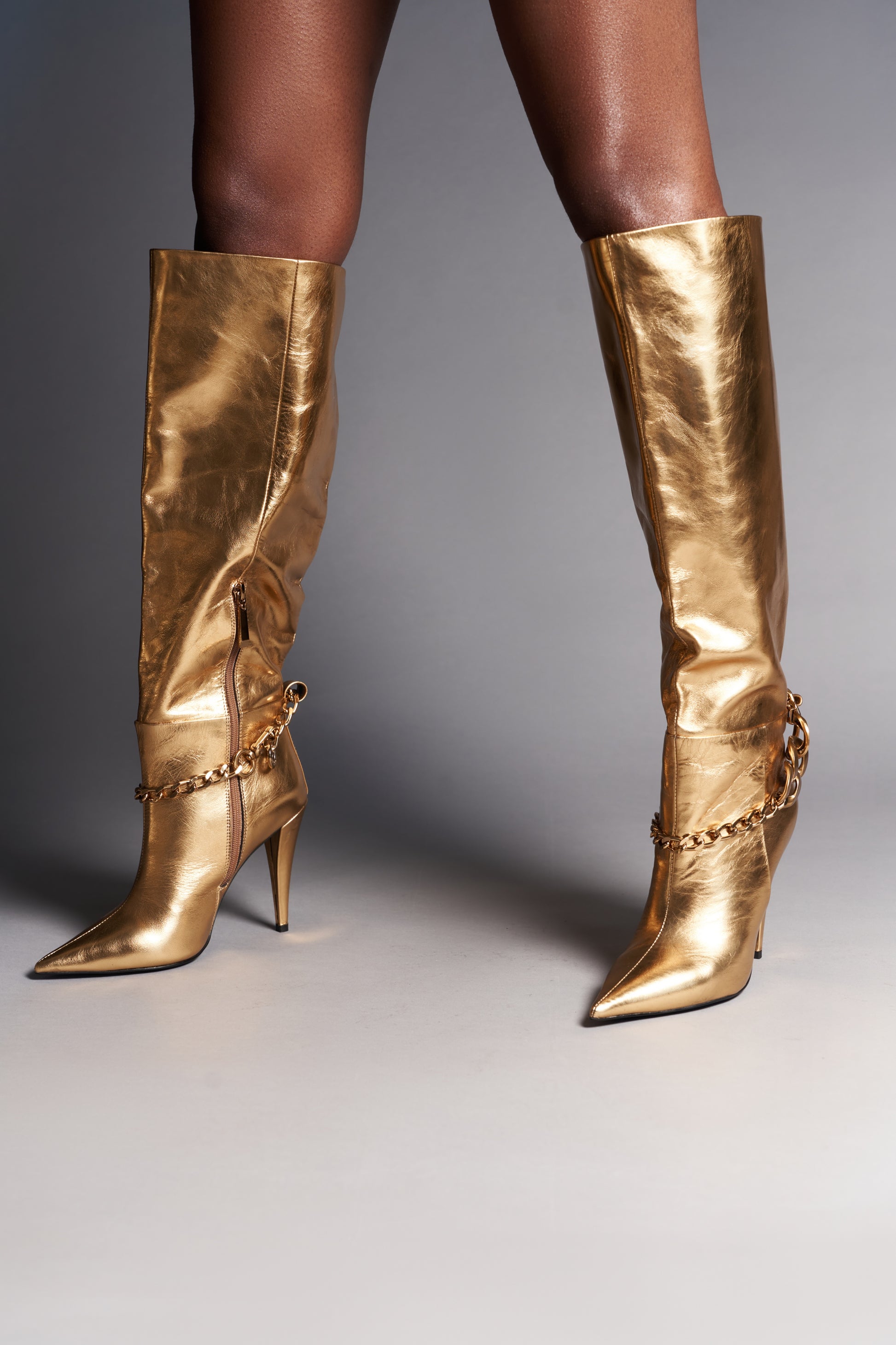 Made of metallic gold leather with a linked chain accent. Not your average gold boot, these steppers are made to hit the town and turn heads. The heel is comfy enough to last you all day or not with not problem.