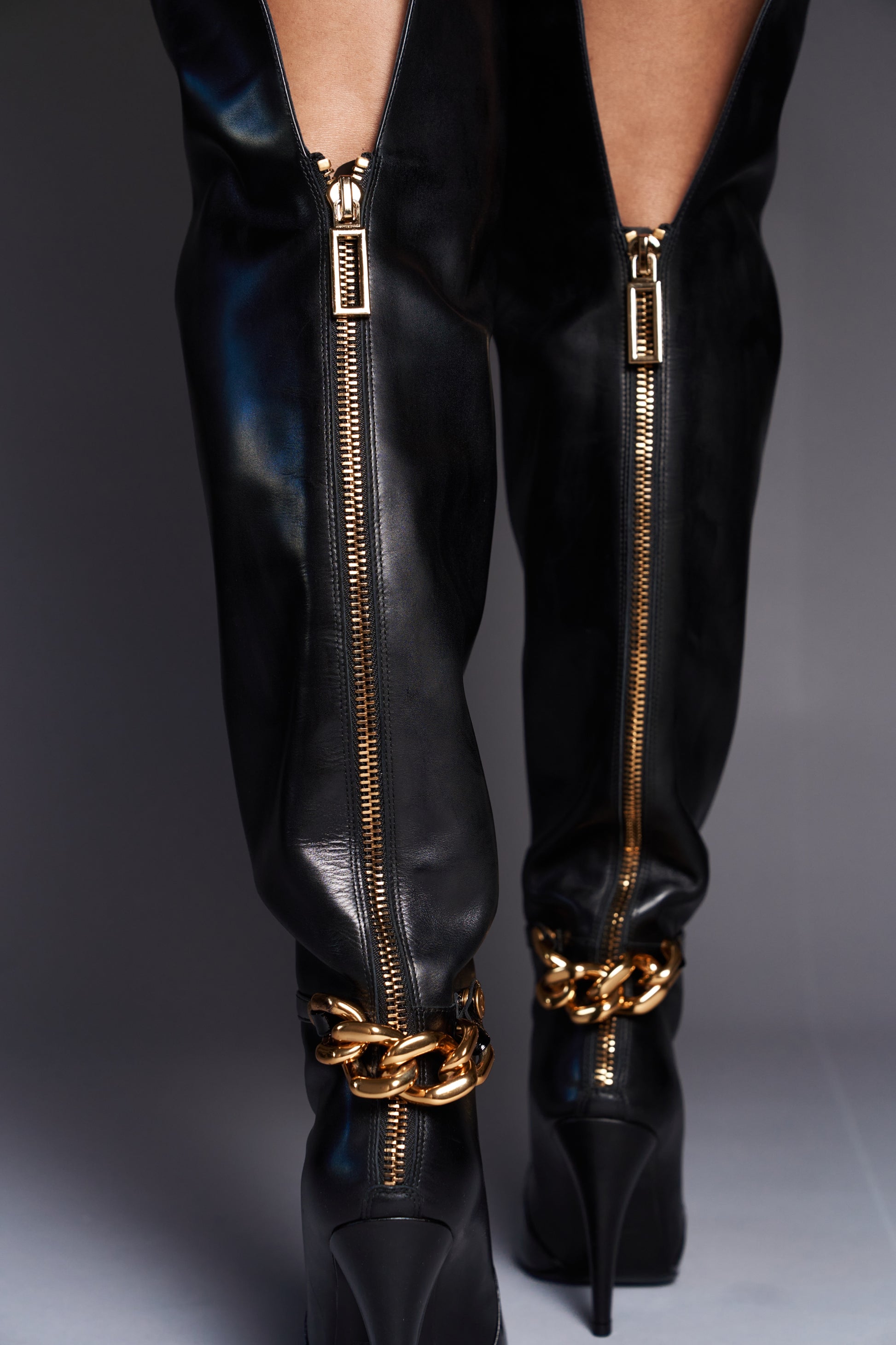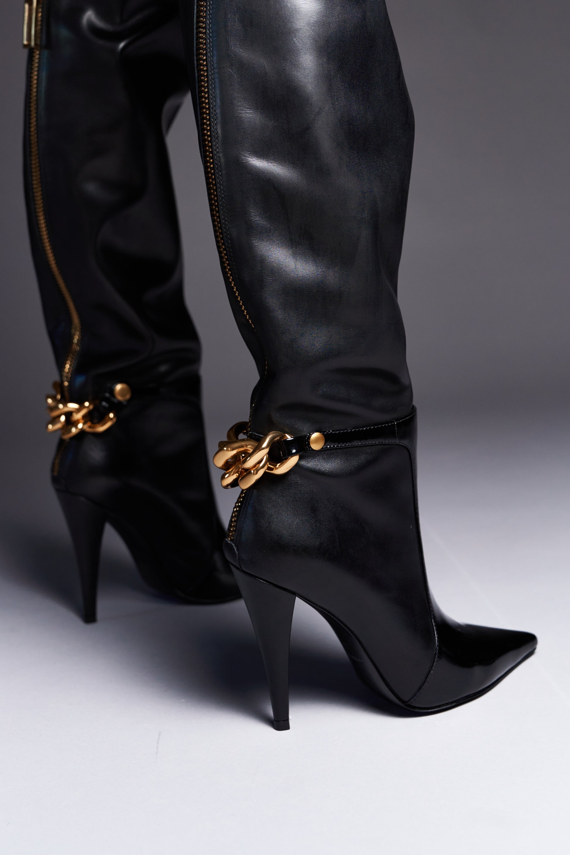Meet the Sheba Boots, a statement-making take on the classic black thigh-high. Crafted from real leather and finished with gold hardware, Sheba effortlessly merges luxury with edge. The patent leather toe, chunky gold chain, and sporty zipper detail bring an unexpected twist to a timeless silhouette.